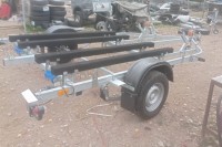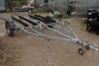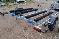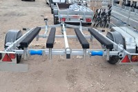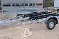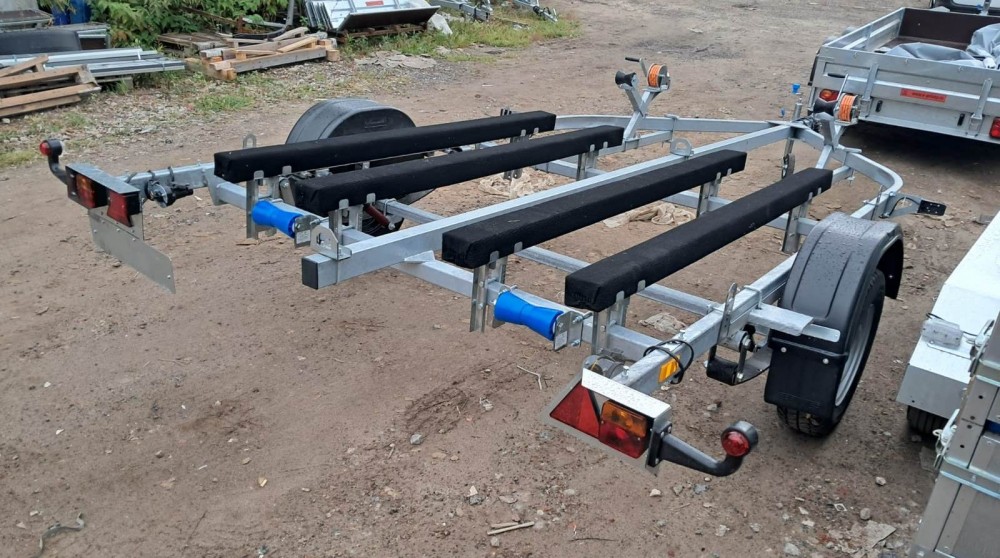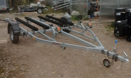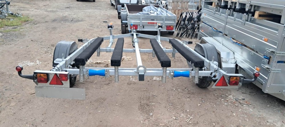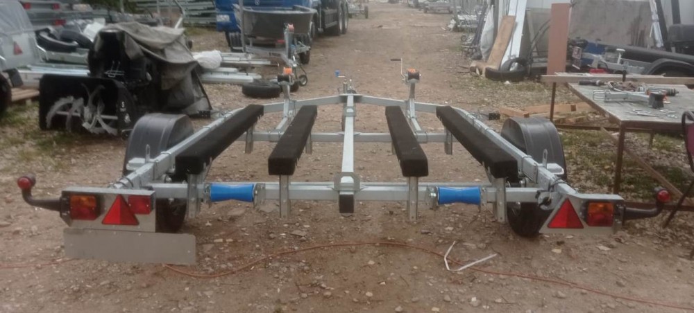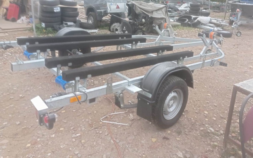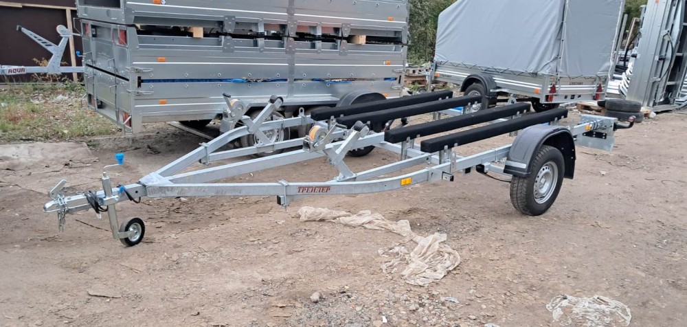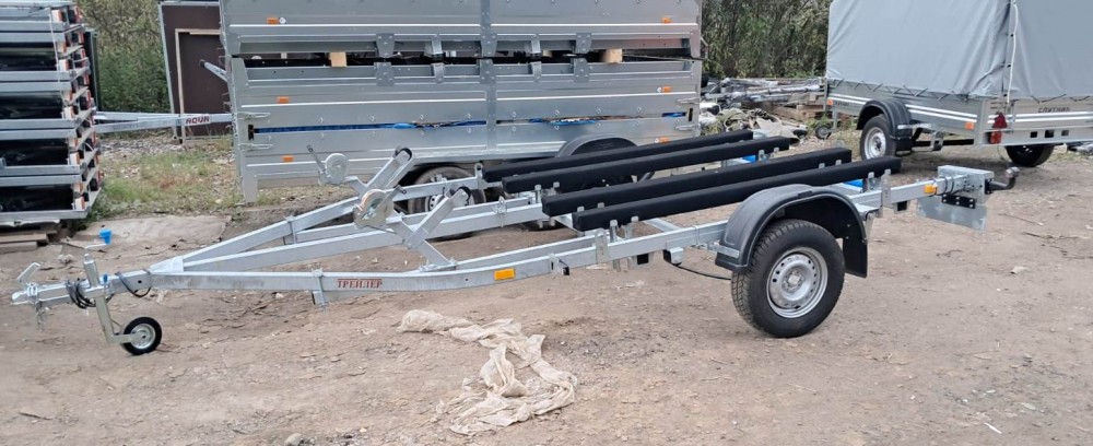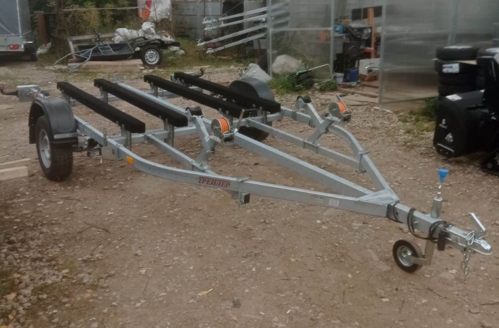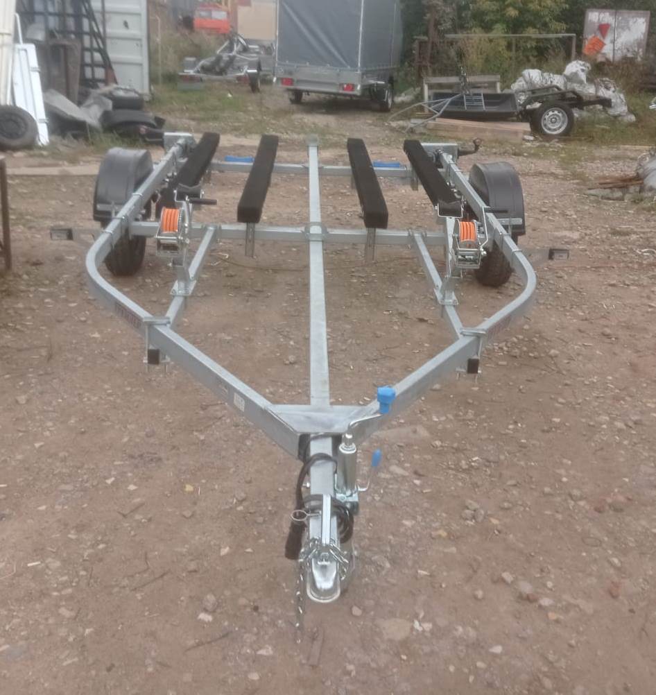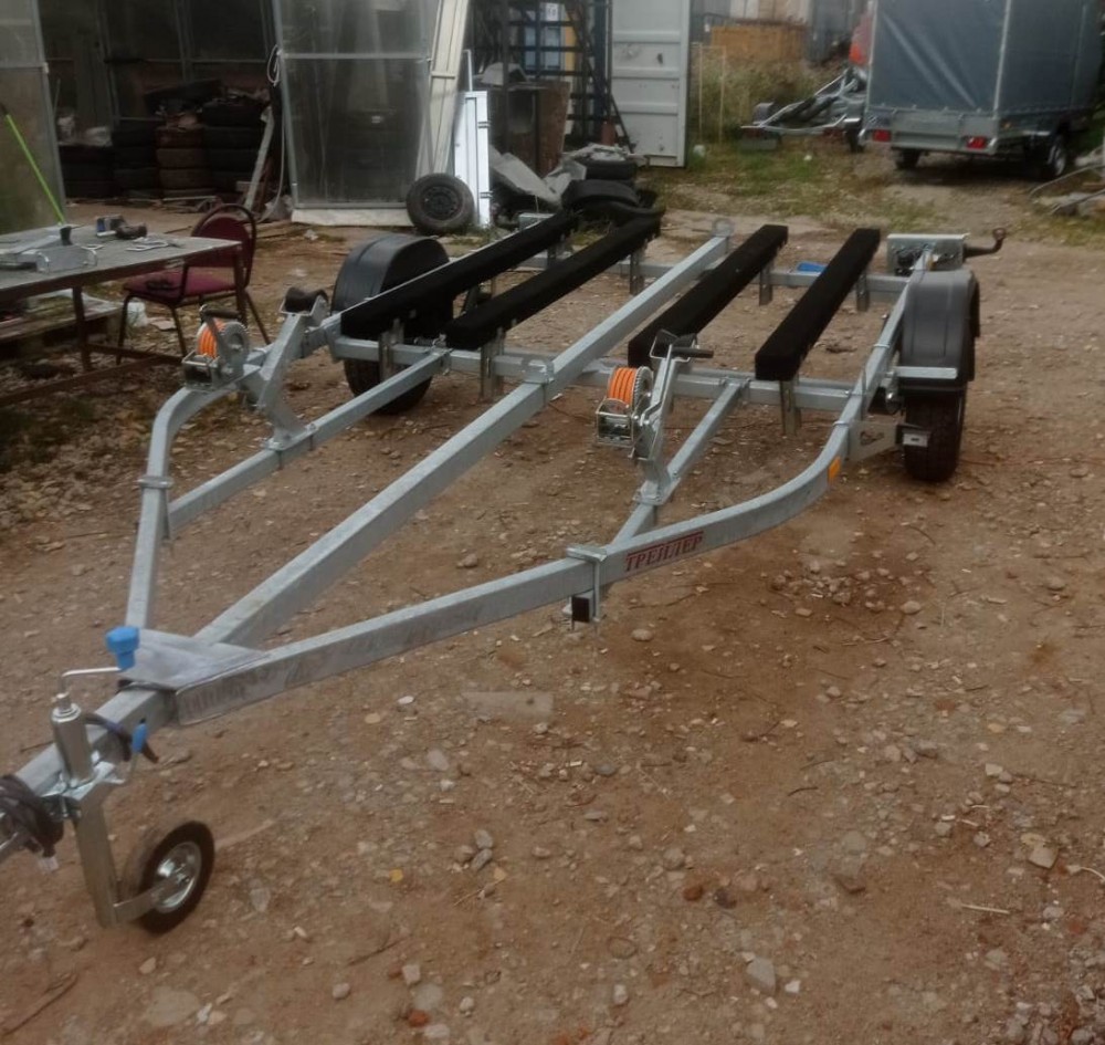 для перевозки двух гидроциклов длиной до 4,3 м, одноосный, без тормозной системы, рессорная подвеска